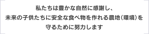 有限会社田園は厳しい栽培基準をクリアして、農産物を栽培しております。環境にこだわり、農薬は通常の50%以下に減らすことはもちろん、有機肥料100%を使用、環境保全のため様々な工夫を重ね、特別な栽培を行っております。より良い安全安心な農産物を皆さんにご提供させていただいております。